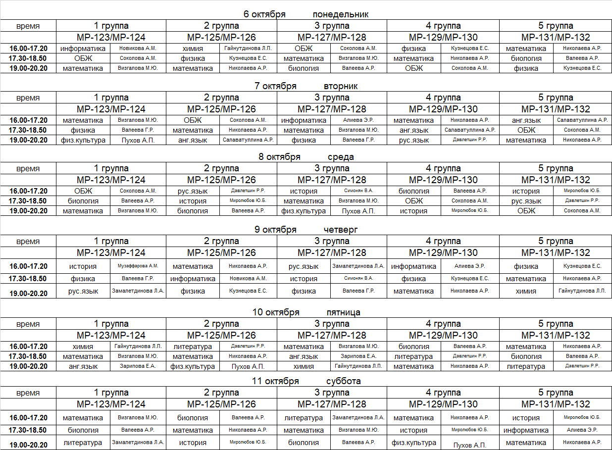 Расписание занятий для студентов Алабуги 6 октября - 11 октября (6 неделя обучения)