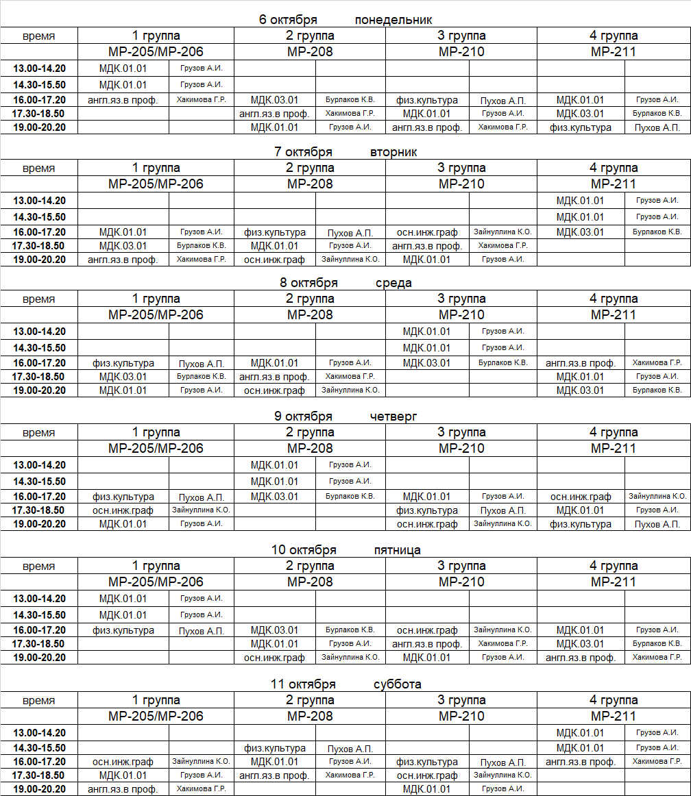 Re: Расписание занятий для студентов Алабуги 6 октября - 11 октября (6 неделя обучения)